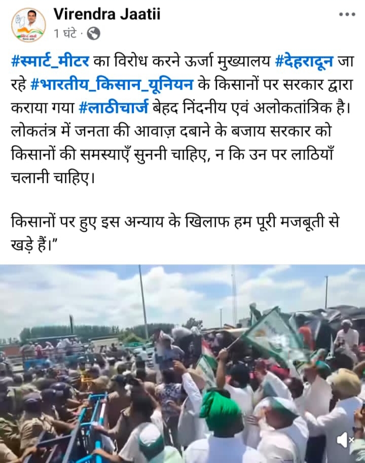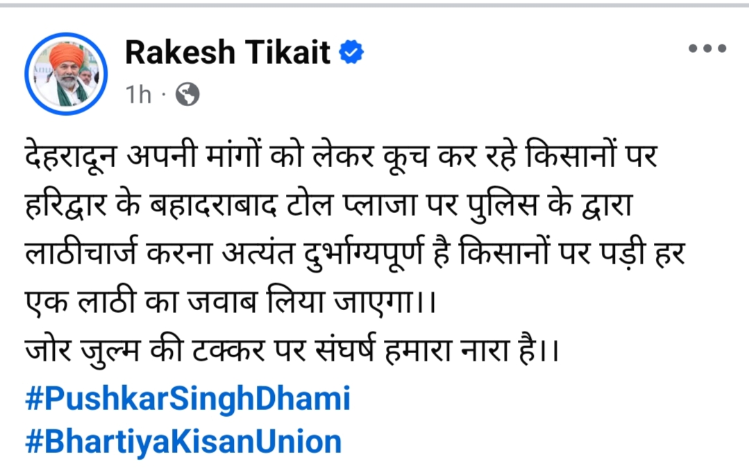 वही भारतीय किसान यूनियन टिकैत के नेता राकेश टिकैत ने सोशल मीडिया पर लिखा कि देहरादून अपनी मांगों को लेकर कूच कर रहे किसानों पर हरिद्वार के बहादराबाद टोल प्लाजा पर पुलिस के द्वारा लाठीचार्ज करना अत्यंत दुर्भाग्यपूर्ण है किसानों पर पड़ी हर एक लाठी का जवाब लिया जाएगा। जोर जुल्म की टक्कर पर संघर्ष हमारा नारा है।