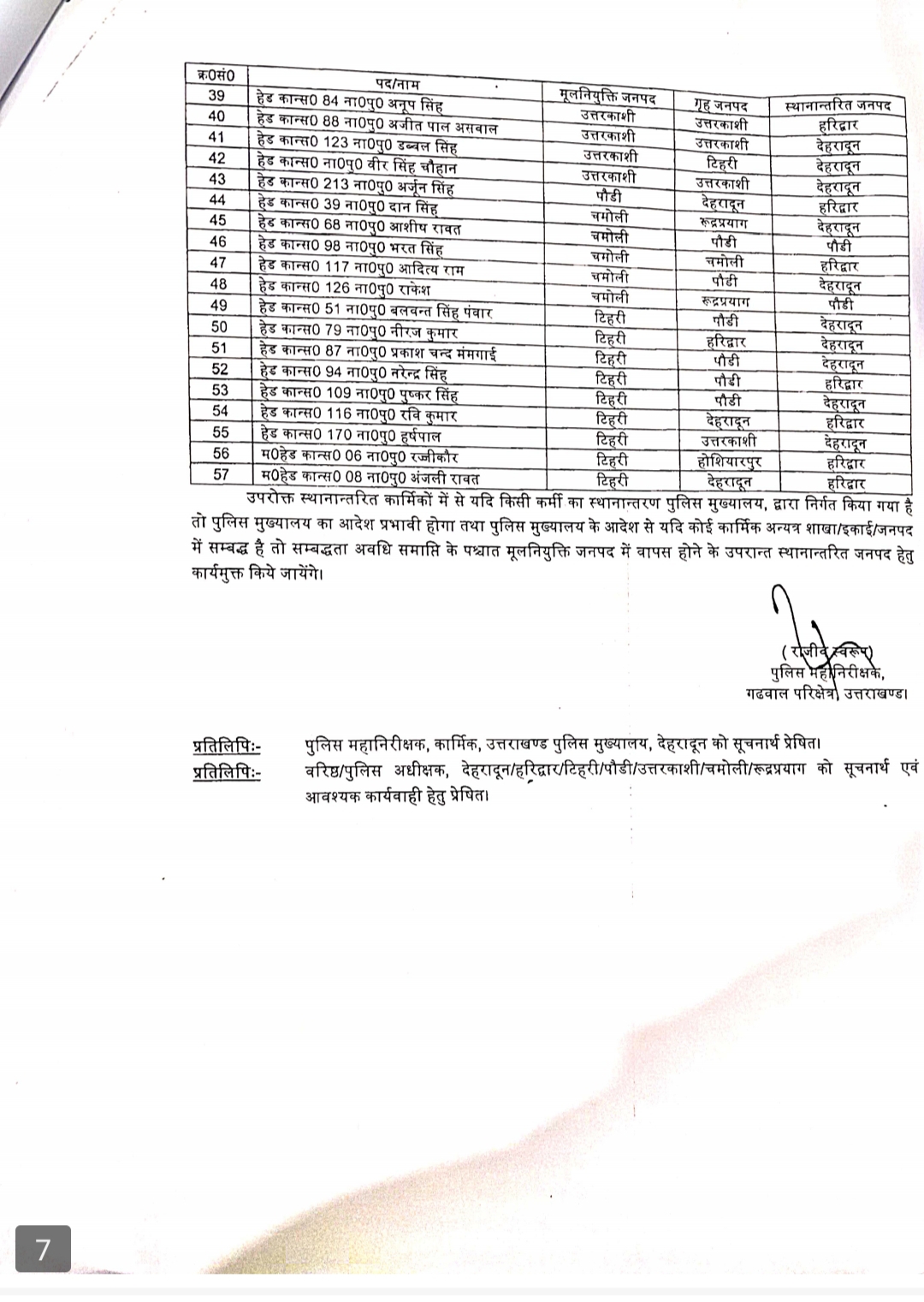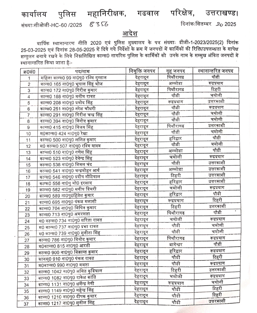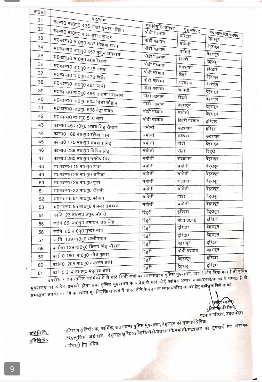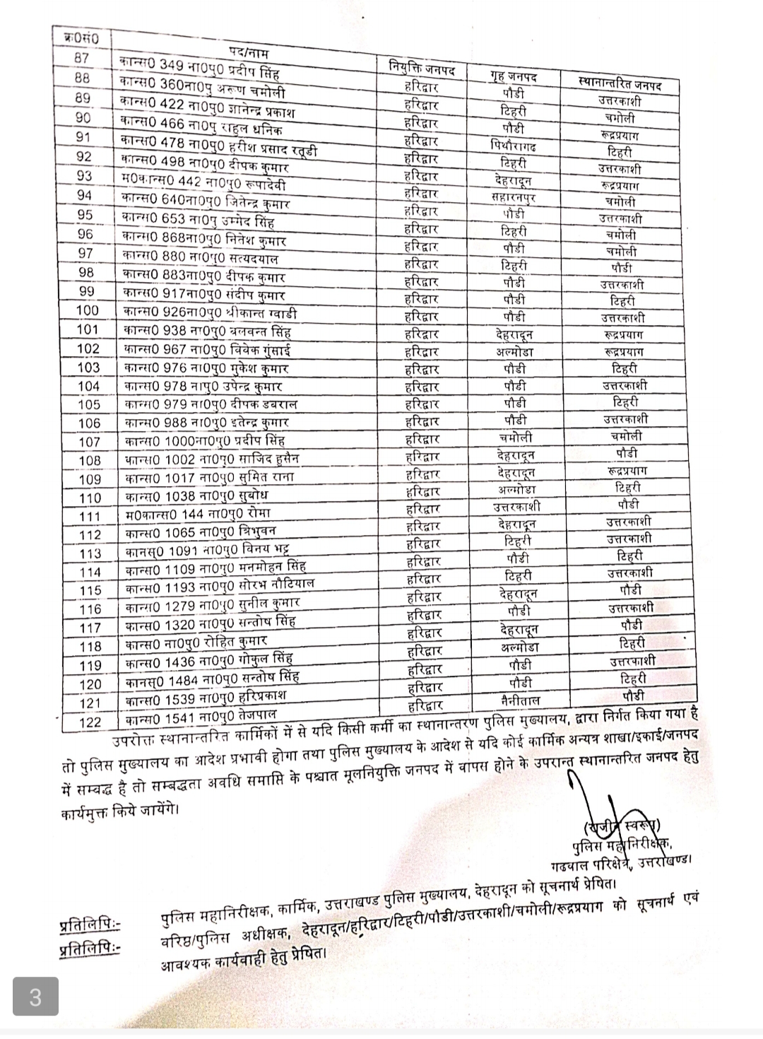 आईजी गढ़वाल राजीव स्वरूप ने बताया है कि पहाड़ी जिलों से मैदानी जिलों में ट्रांसफर पुलिसकर्मी एएसआई 9, हेड कॉन्स्टेबल 45 और कॉन्स्टेबल 106 का ट्रांसफर किया गया है।