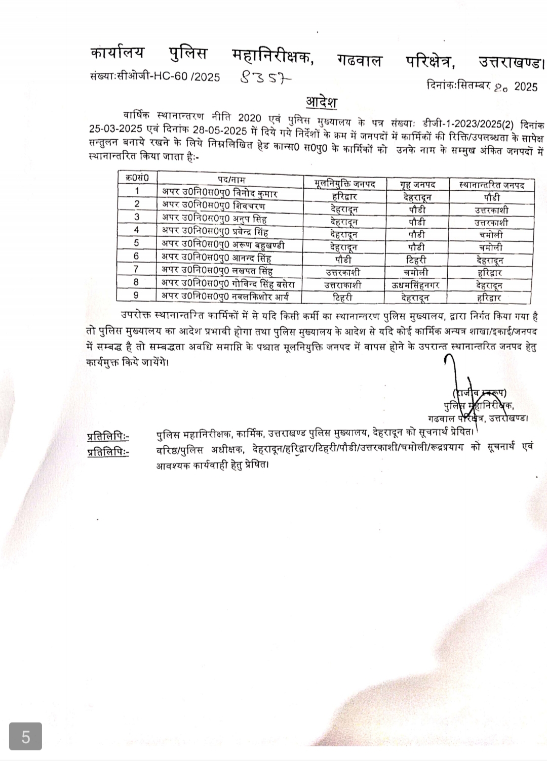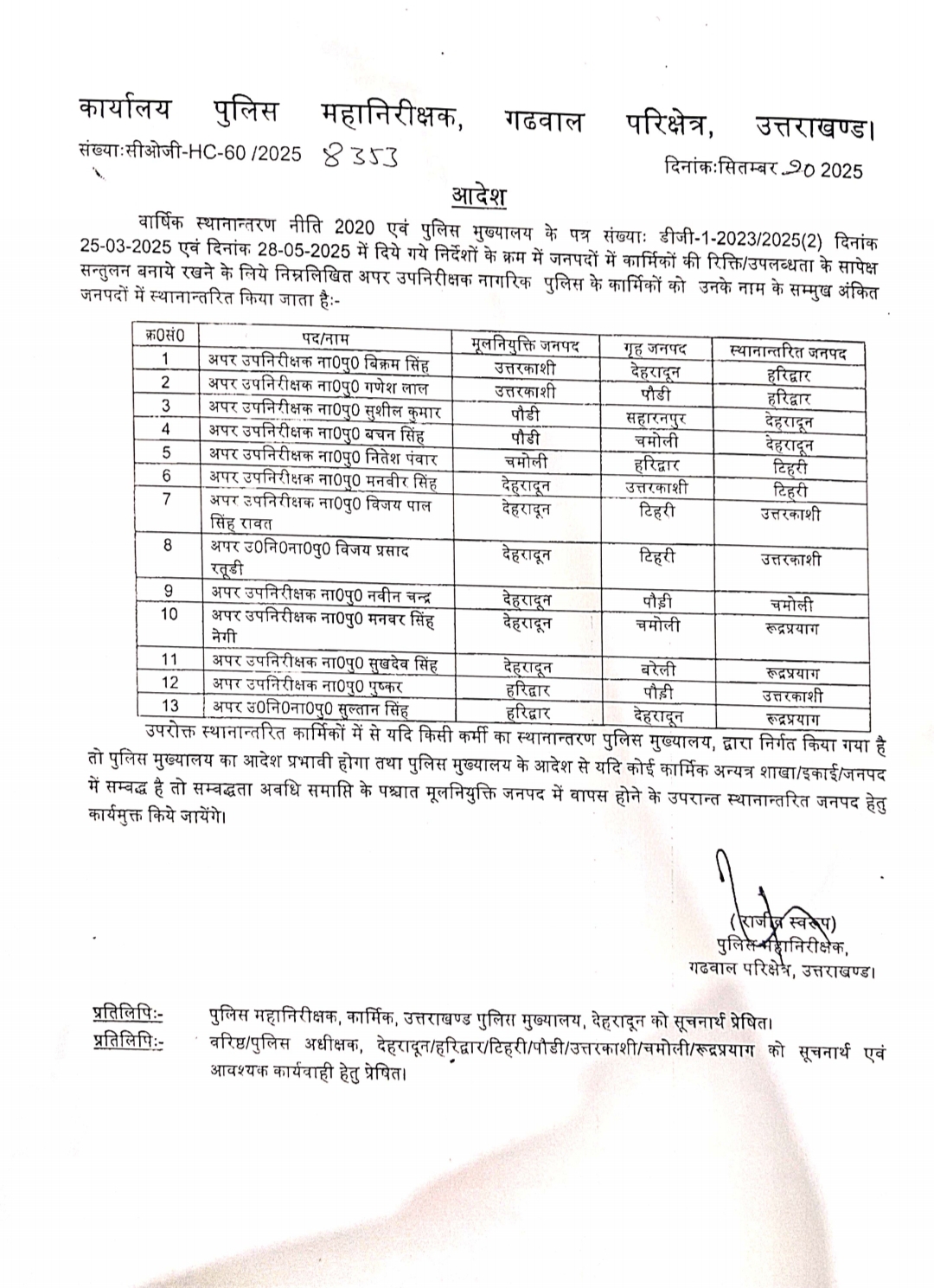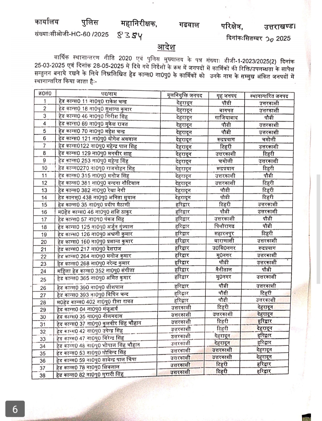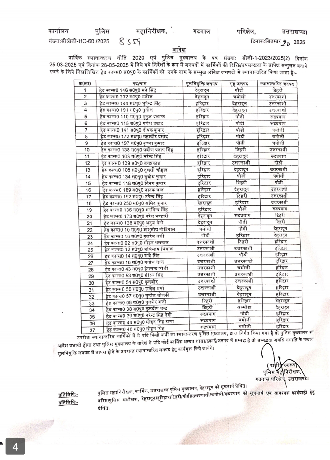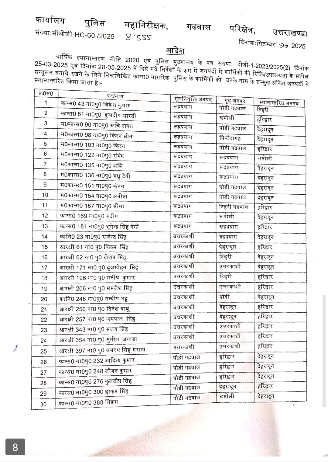 आईजी गढ़वाल राजीव स्वरूप ने बताया है कि पहाड़ी जिलों से मैदानी जिलों में ट्रांसफर पुलिसकर्मी एएसआई 9, हेड कॉन्स्टेबल 45 और कॉन्स्टेबल 106 का ट्रांसफर किया गया है।
