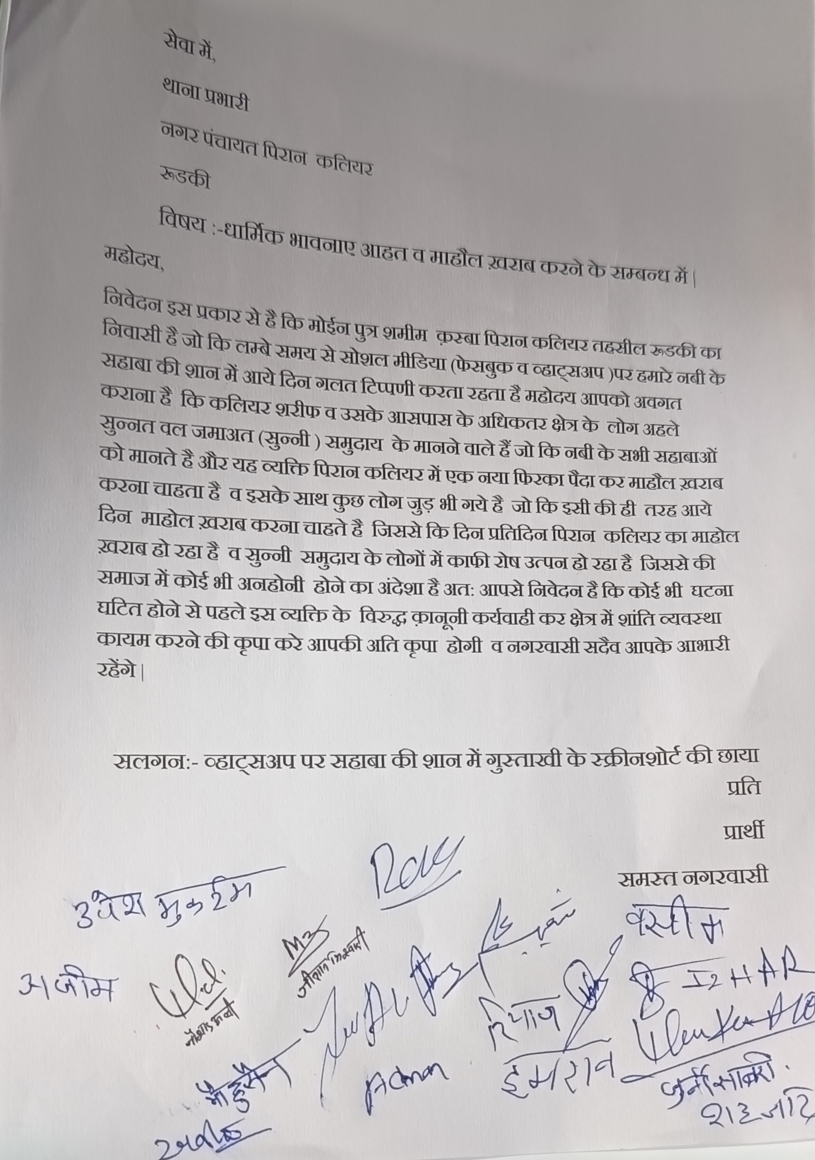 जोकि आए दिन क्षेत्र का माहौल खराब करने की कोशिश कर रहे हैं। जिसके चलते विशेष समुदाय के लोगों में काफी आक्रोश हैं। वही उन्होंने थानाध्यक्ष को ज्ञापन सौंपा कार्यवाही की मांग की हैं।