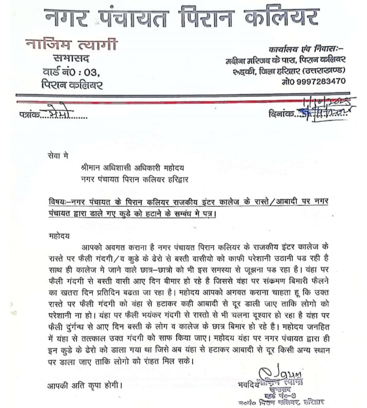 पिरान कलियर नगर पंचायत के वार्ड 03 के सेकेंड टर्म के सभासद नाजिम त्यागी ने नगर पंचायत ईओ कुलदीप सिंह चौहान को लिखित में पत्र देते हुए बताया कि नगर पंचायत पिरान कलियर के राजकीय इंटर कॉलेज के रास्ते पर फैली गंदगी/व कुडे के ढेरो से कस्बेवासियों को काफी परेशानी उठानी पड रही है।