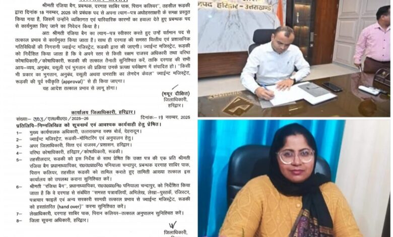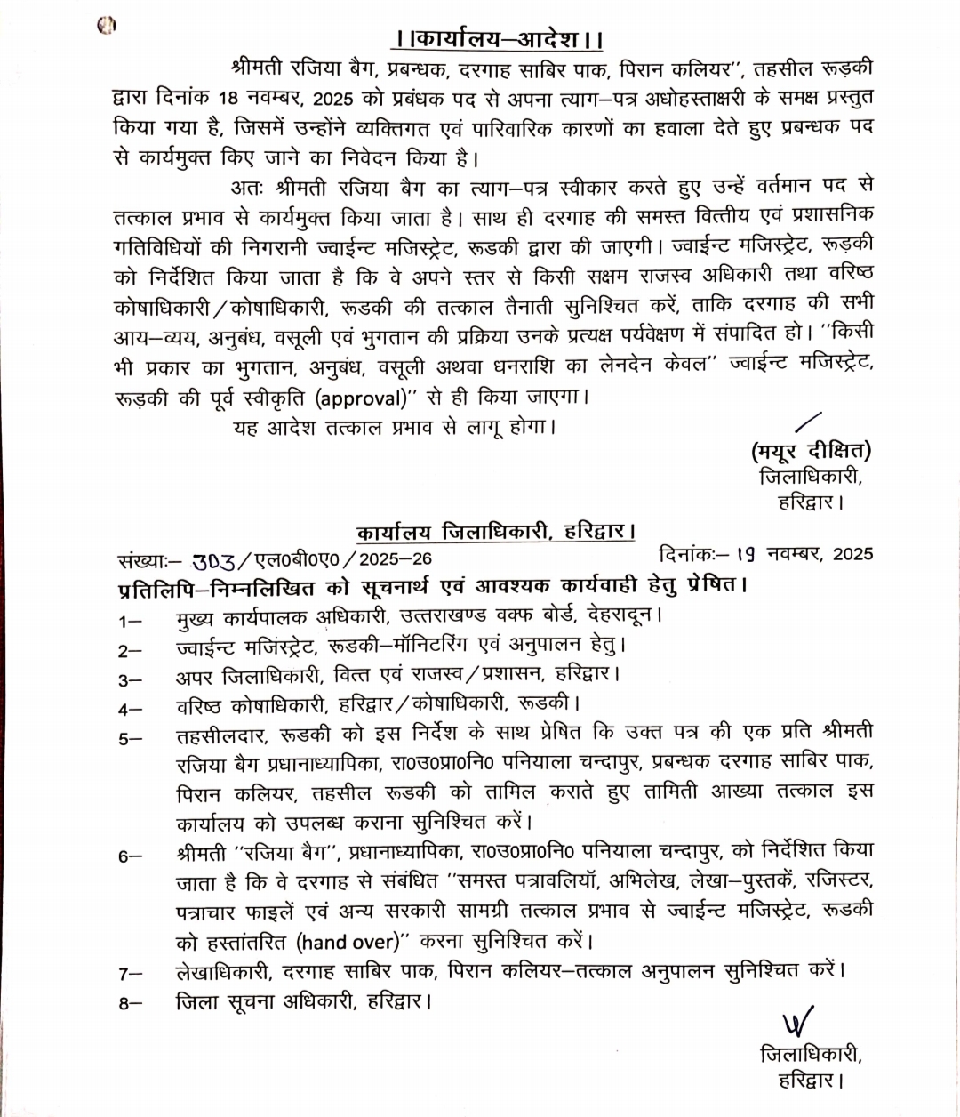 जिलाधिकारी मयूर दीक्षित ने दरगाह प्रबंधक रजिया बैग का त्याग पत्र स्वीकार करते हुए उन्हें वर्तमान पद से तत्काल प्रभाव से कार्यमुक्त कर दिया। साथ ही दरगाह की समस्त वित्तीय एवं प्रशासनिक गतिविधियों की निगरानी ज्वाइंट मजिस्ट्रेट रूड़की को सौंपी हैं।