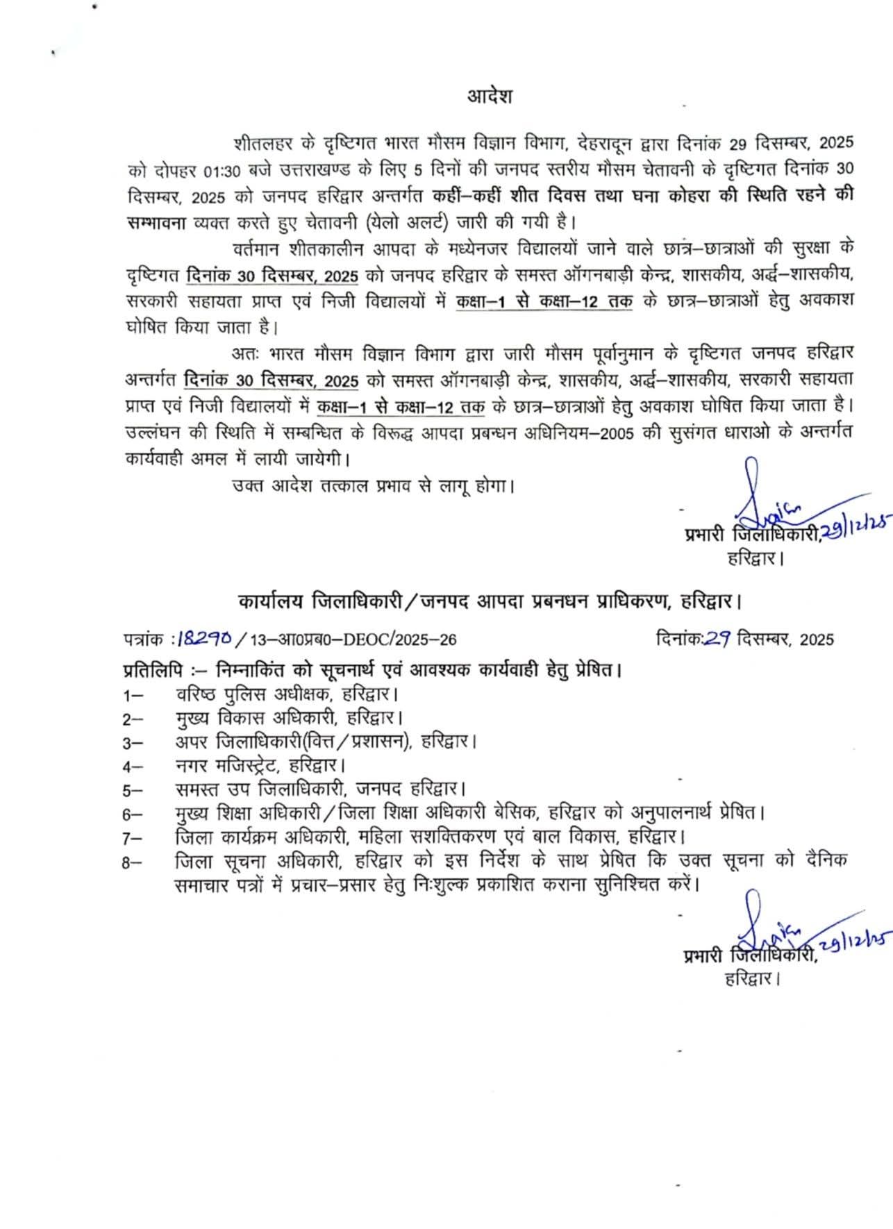 इसके साथ ही प्रभारी जिलाधिकारी ने कल सरकारी और निजी स्कूल-कॉलेज बंद रखने के दिशा-निर्देश दिए हैं। जिसमें कक्षा 1 से लेकर 12 तक स्कूलों को बंद रखने के निर्देश दिए गए हैं। वही समस्त आंगनवाड़ी केंद्र भी बंद रहेंगे।