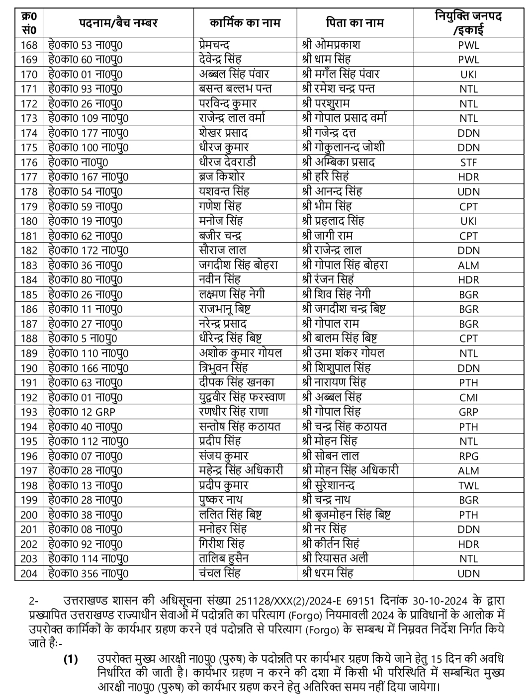उत्तराखंड पुलिस के 204 हेड कांस्टेबल प्रमोशन पाकर अपर उपनिरीक्षक (ASI) बन गए हैं। उत्तराखण्ड पुलिस महानिदेशक दीपम सेठ ने सभी पदोन्नत पुलिस कर्मियों को बधाई दी।