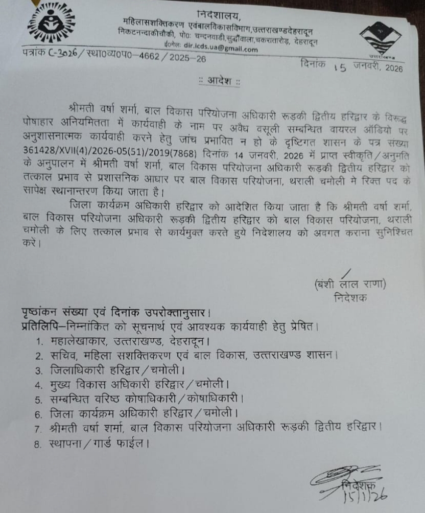 क्लिक उत्तराखंड:-(ब्यूरो) रुड़की क्षेत्र में पोषाहार वितरण से जुड़ी अनियमितताओं पर पर्दा डालने की एवज में अवैध वसूली के कथित ऑडियो वायरल होने की जांच के बीच रुड़की सीडीपीओ वर्षा शर्मा का स्थानांतरण कर दिया गया है।