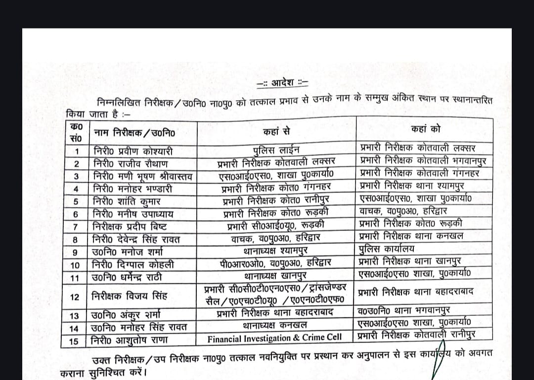 क्लिक उत्तराखंड:-(बुरहान राजपूत) एसएसपी हरिद्वार प्रमेंद्र सिंह डोबाल 11 इंस्पेक्टरो समेत 15 पुलिसकर्मियों की कुर्सी में फेरबदल किया हैं।