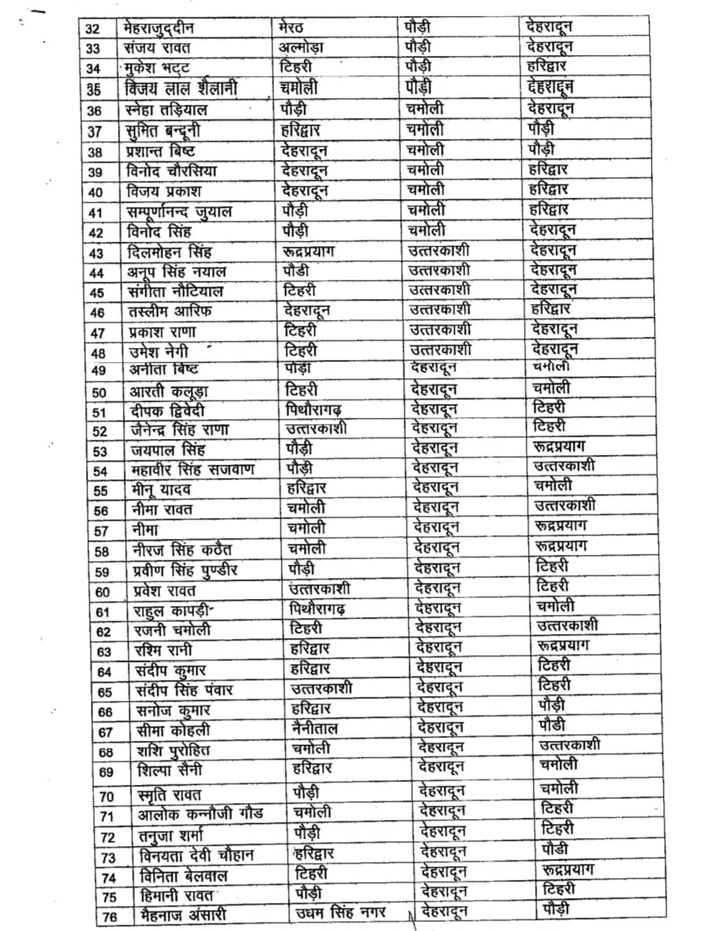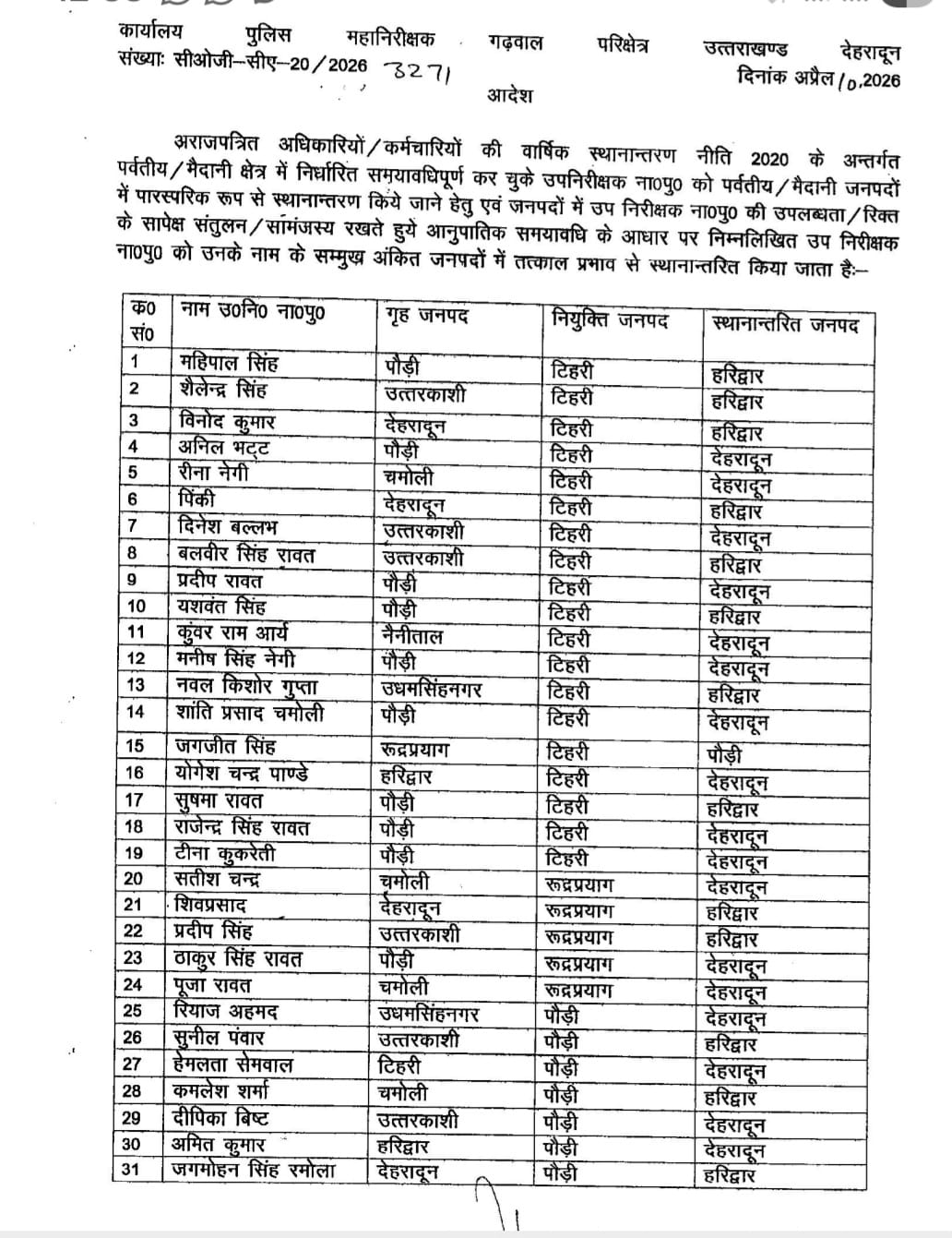 जारी आदेश के अनुसार देहरादून, हरिद्वार, टिहरी, पौड़ी, उत्तरकाशी, रुद्रप्रयाग और चमोली जिलों में तैनात उपनिरीक्षकों को नई तैनाती दी गई है। लंबे समय से मैदानी क्षेत्रों में कार्यरत उपनिरीक्षकों को पर्वतीय जिलों में और पर्वतीय क्षेत्रों में तैनात कर्मियों को मैदानी जनपदों में भेजा गया है।