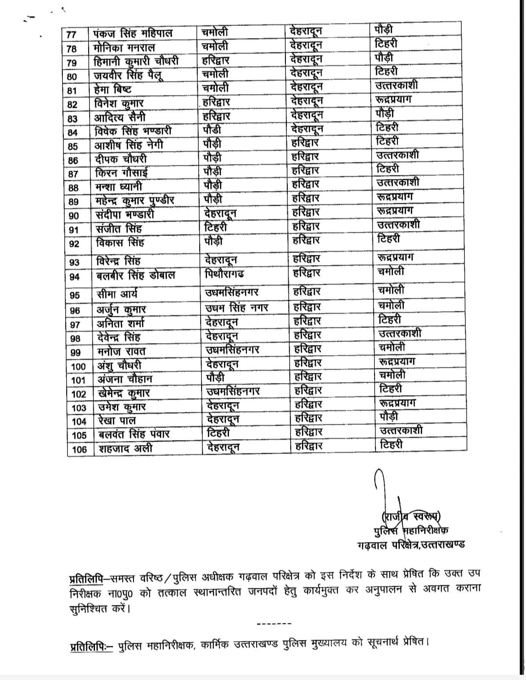 आईजी गढ़वाल राजीव स्वरूप ने देर रात गढ़वाल परिक्षेत्र के 106 दरोगाओं को पहाड़ से मैदान और मैदान से पहाड़ पर ट्रांसफर किया है। आईजी गढ़वाल ने वार्षिक स्थानांतरण नीति के तहत कर्मचारियों के स्थानांतरण किए हैं।