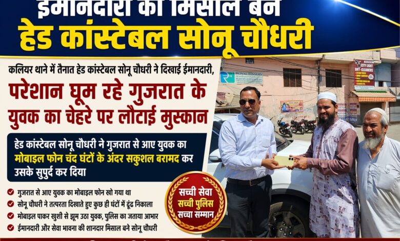 महज चंद घंटों के भीतर गुजरात निवासी युवक का मोबाइल फोन सकुशल बरामद कर उसके सुपुर्द कर दिया, जिसके बाद मोबाइल स्वामी ने पुलिस और हेड कांस्टेबल सोनू चौधरी की जमकर सराहना की हैं।