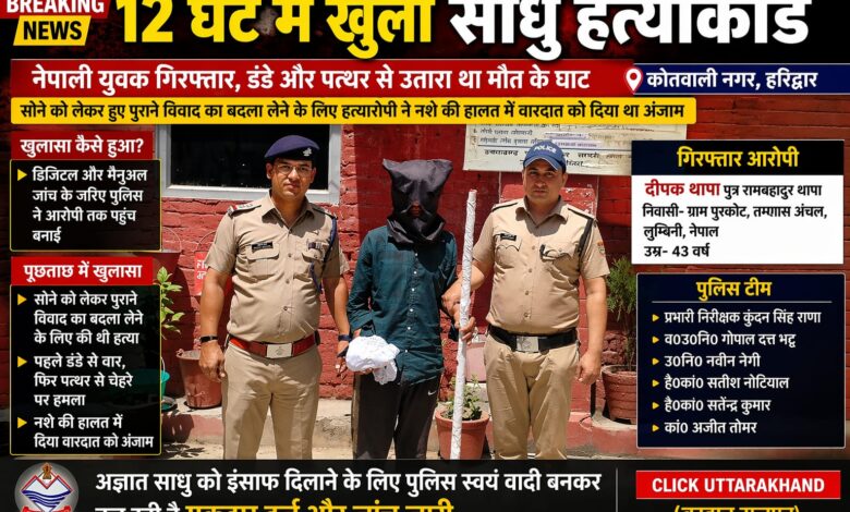 क्लिक उत्तराखंड:-(बुरहान राजपूत) हरिद्वार कोतवाली नगर क्षेत्र में हुए सनसनीखेज साधु हत्याकांड का पुलिस ने महज 12 घंटे के भीतर खुलासा कर दिया। पीपल के पेड़ के नीचे रह रहे अज्ञात साधु की डंडे और पत्थर से हत्या कर दी गई थी।